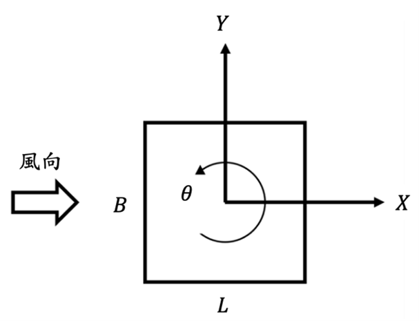 下圖為高層建築斷面及順風向、橫風向、扭轉向座標示意圖。